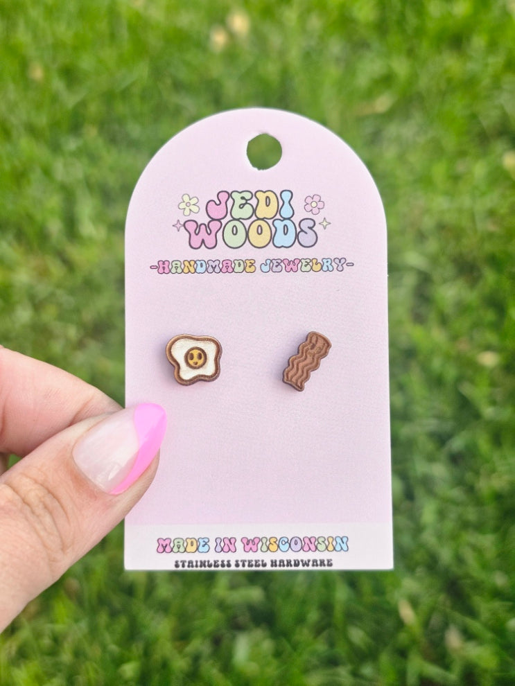 Bacon and Egg Wooden Handpainted Stud Earrings