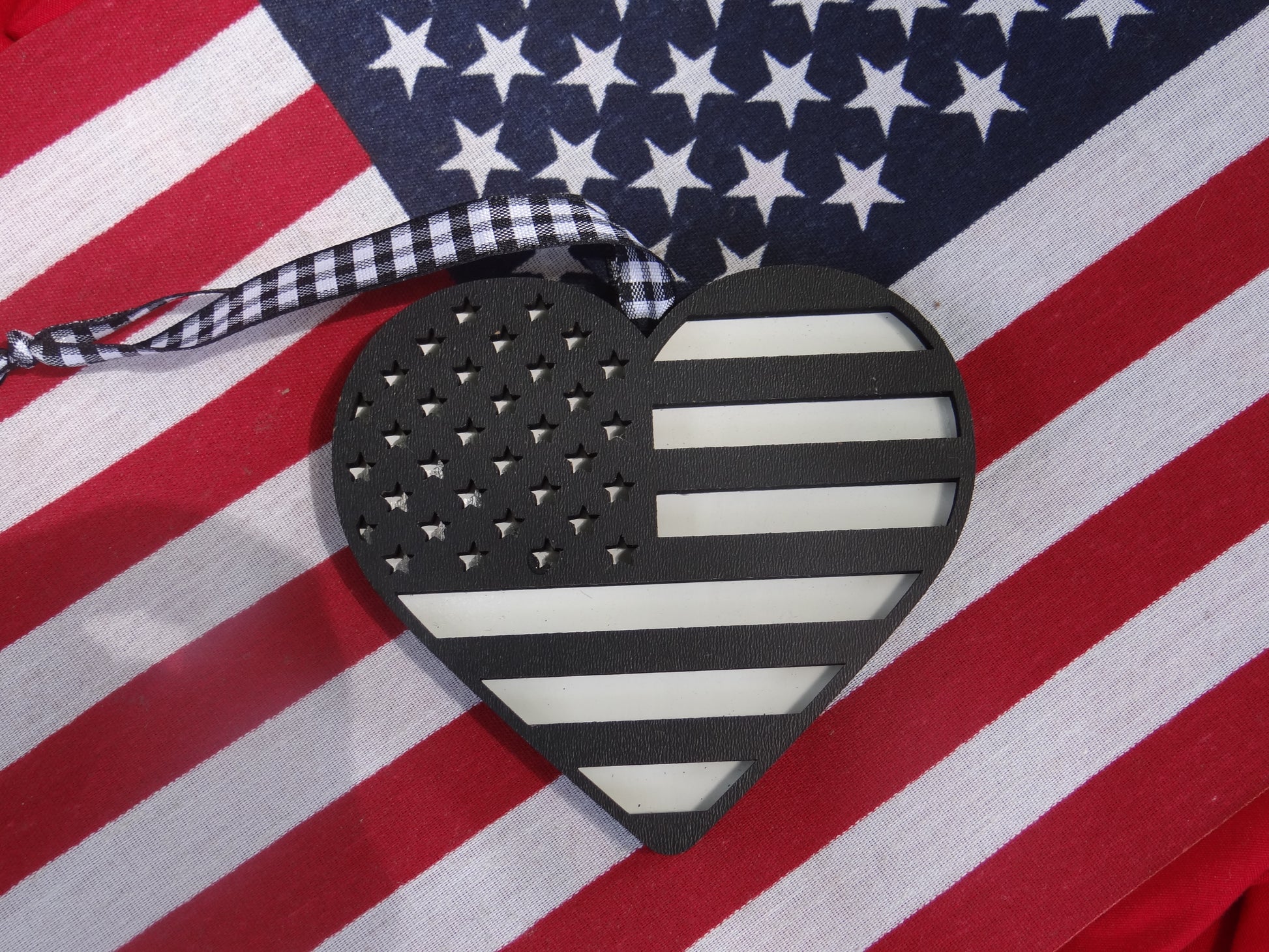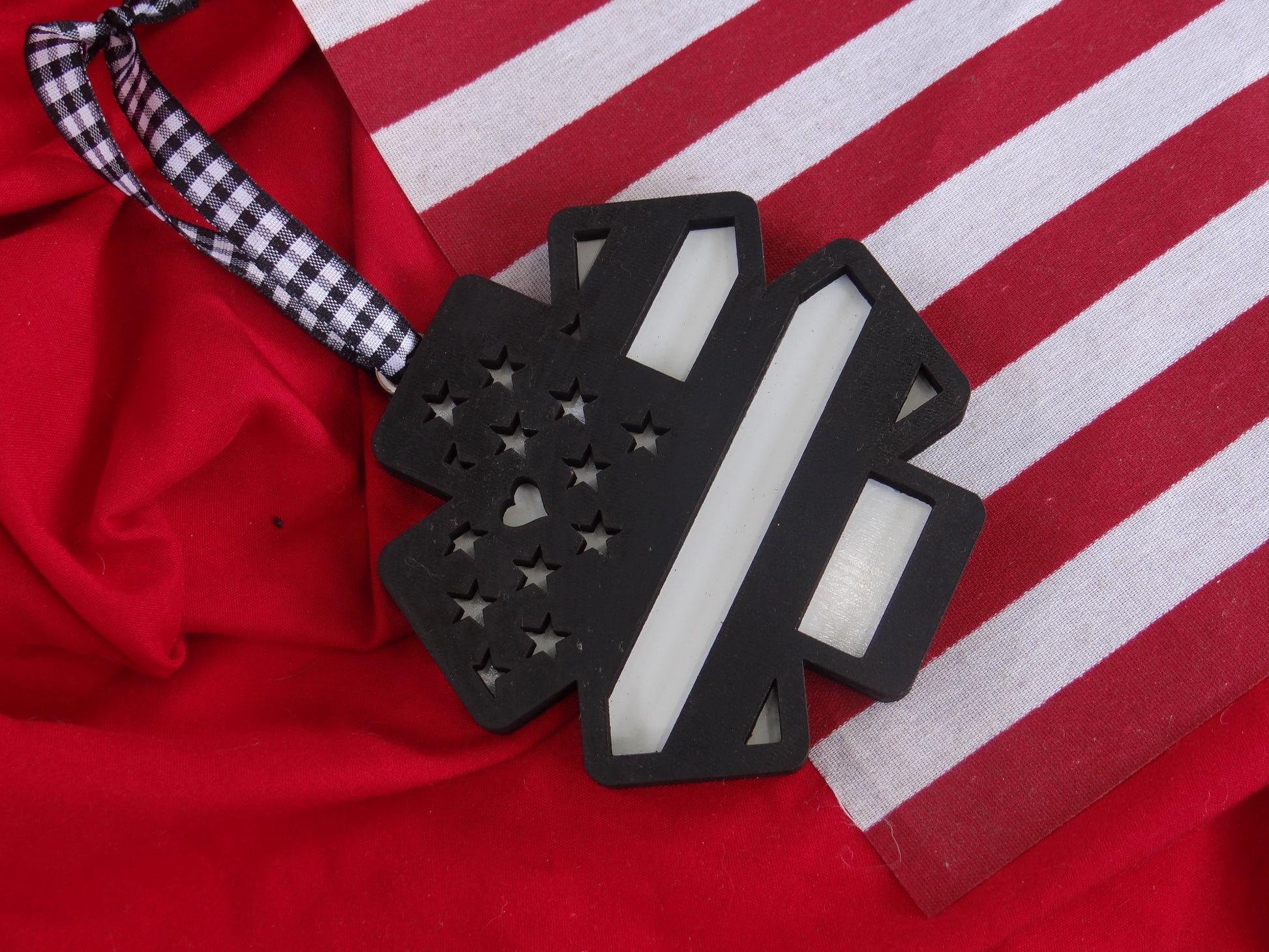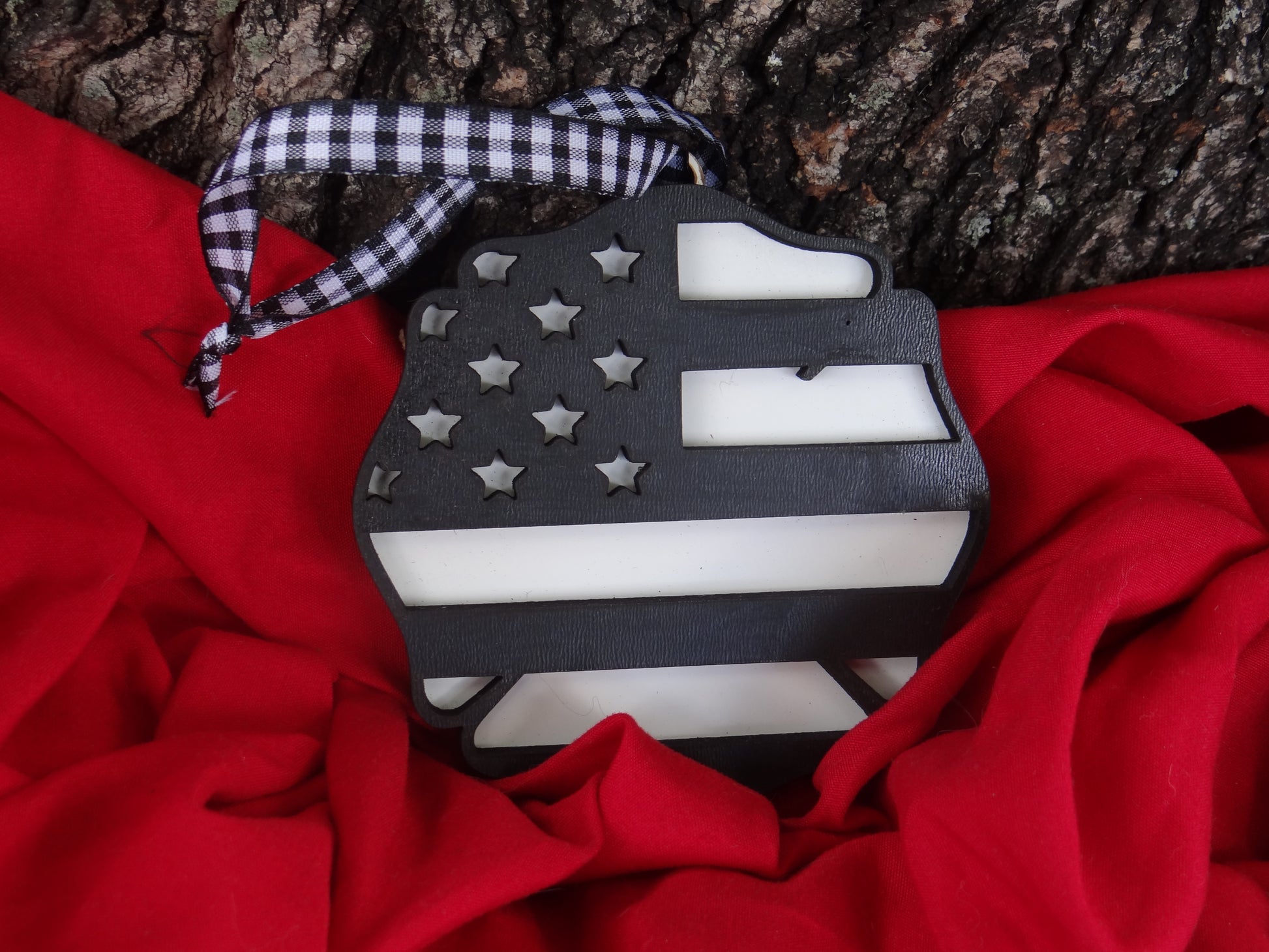 This collection include Police, Fire, Paramedics. Also included is a heart shape and star shape to represent all first responders. Each Ornament is made of two layers and comes with a black and white plaid ribbon for easy hanging.