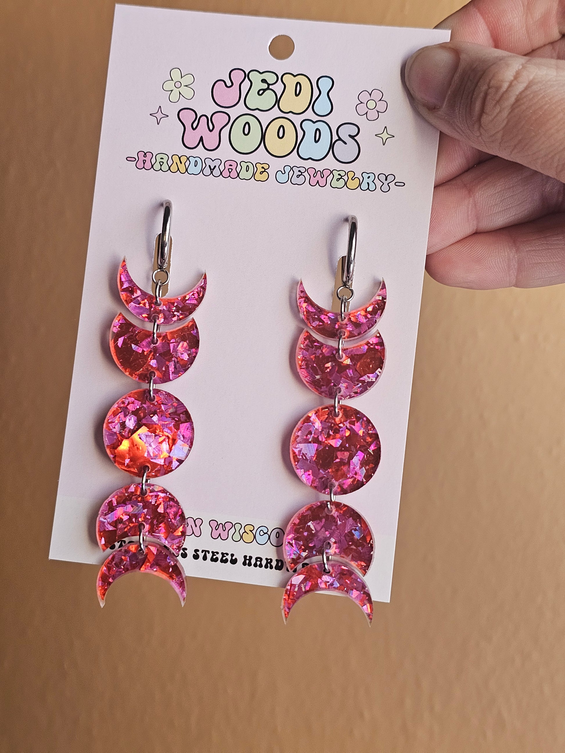 Pink Crackle Glass Moon Phase Earrings